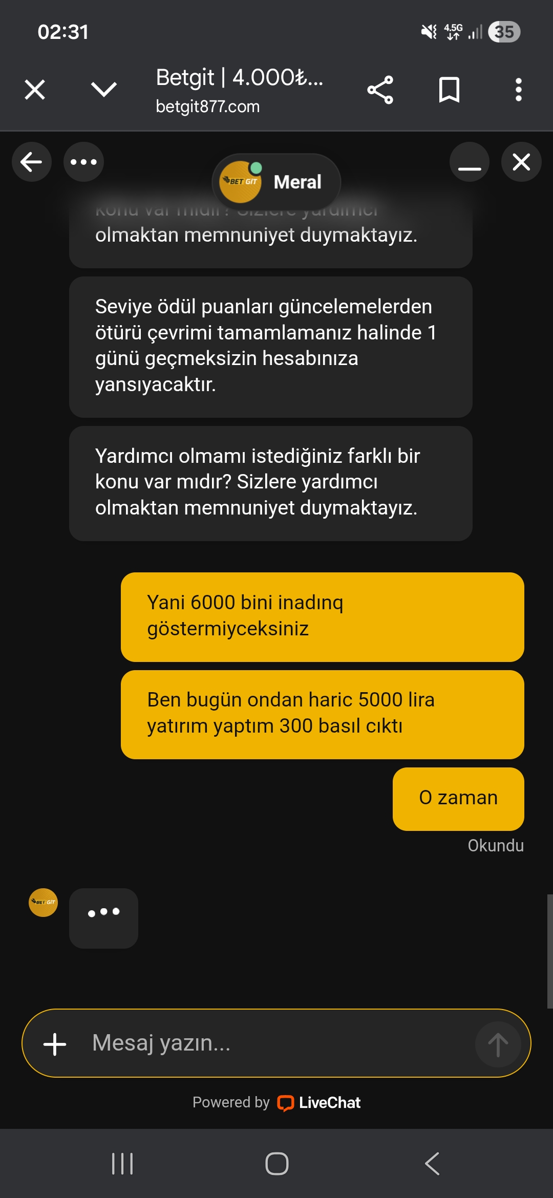 Platin II seviyesi olan 6000 puan icin en son puanım 5953 iken 1000 tl daha yatırım yaptım sonra canlı destek e bağlandım ve 1000 tl yatırım a 2,5 puan yükseliceğini söylediler tam o arada resmini yolladığım konuşma yapıldı bende seviye ...